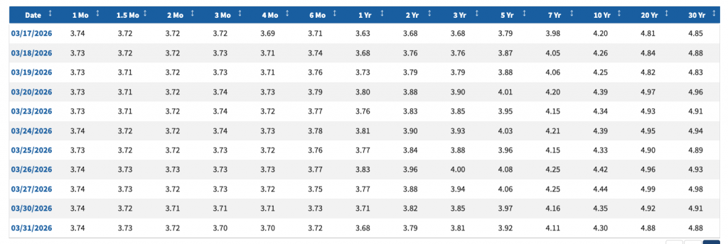 Now that we’ve learned the theory, let’s look at the actual market. As of today (March 31, 2026), here are the key US Treasury yields: